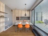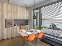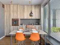 - La sala de estar conectada con la cocina es una amplia habitación de 21,87 m2. Todo el apartamento está amueblado con muebles hechos a medida, de color roble. La cocina tiene un horno SMEG, lavavajillas Siemens y nevera Liebher. También hay una placa de inducción y un lavabo de cobre con un grifo de cobre. El conjunto tiene muchos elementos de cobre, por ejemplo, el hervidor, macetas super exclusivas, cubierto - todo esto es también cobre. Esto crea un estilo original, que sugiere visiblemente un diseño bien pensado del arquitecto propietario del apartamento.