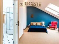 El dormitorio con una cama doble grande y sillones es un espacio con su propio armario con una ventana y amplio baño con ducha, aseo, lavabo y lavadora.