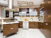 En los muebles de cocina en el edificio con electrodomésticos (nevera, lavavajillas, horno, vitrocerámica) y una barra de desayuno estilo isla.