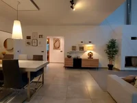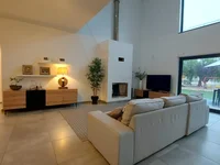Al entrar, la sensación inmediata es de espacio y luminosidad. El salón principal, con doble altura y amplias superficies acristaladas, constituye el corazón de la casa. Este ambiente reúne la zona de estar y el comedor en un espacio continuo, muy bien organizado y decorado con elementos modernos y discretos. Los grandes ventanales que se abren al jardín no solo iluminan el interior, sino que crean una transición armoniosa entre el confort de la vivienda y el paisaje exterior. La chimenea de diseño contemporáneo aporta un toque acogedor, convirtiendo este espacio en un lugar ideal tanto para momentos de tranquilidad como para recibir a familiares y amigos.
