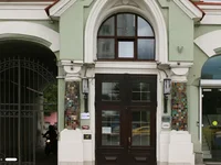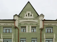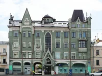 A three-story mansion on Sadovaya-Karetnaya Street in Tver district. The facade of the building is made in modern style, the main entrance is highlighted by the pointed Gothic turret and columns with Mayolik.