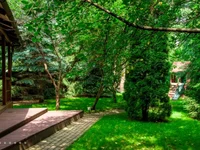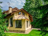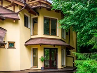 a country house with an area of 340 m ² Built on a forest plot of 12.8 acres. The facade is lined with yellow plaster, decorated with a stone in basement and dark beams.