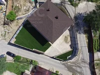 Durante la construcción, un hermoso césped verde creció frente a la casa, queda por colocar el jardín )