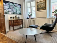 El apartamento se vende con muebles premium cuidadosamente seleccionados. Amplias habitaciones, techos altos y vistas panorámicas del centro de la ciudad, el Castillo de Liubliana y la Universidad crean una sensación de coziness y elegancia.