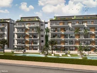 Este complejo hermoso consiste de 3 casas habitables. En cada bloque hay 5 pisos. Hay algunos modelos de los apartamentos: el primer piso con el jardín, los pisos centrales con la terraza y penthaus con el solario.