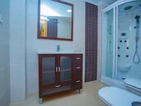 Siguiendo el pasillo, lo guiarán a dos habitaciones más y un moderno baño adicional separado equipado con una ducha de hidromasaje. Esas habitaciones podrían usarse como dormitorios o también como sala de oficina. Todo el piso viene con un sistema de aire acondicionado central preinstalado.