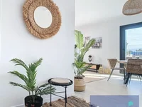 Estamos ante un inmueble de obra nueva de estilo mediterráneo, con materiales de alta calidad que se combinan elegantemente entre sí, dándoles a sus espacios un carácter atemporal donde predomina la luminosidad. Gracias a la búsqueda incesante de su eficiencia, cuenta con amplias ventanas de suelo a techo en pvc oscuro, en sus dos dormitorios, cocina y salón, favoreciendo la ventilación cruzada y la entrada durante todo el día de luz por sus dos fachadas. Suelos en gres porcelánico imitación madera, con calefacción radiante, gestionado por un sistema de aerotermia centralizado, que al mismo tiempo abastece a la vivienda de agua caliente. Completando el sistema de climatización cuenta con bomba de calor y frio por conductos, con control airzone en cada estancia. Su cocina vestida en muebles bajos lacados en blanco, encimera de cuarzo en blanco roto y sus muebles altos en madera, se encuentra equipada con placa de inducción, horno multifunción y microondas empotrados. La cocina abierta al salón comedor tiene salida directa a una de las zonas de terraza, al igual que su zona de comedor y la zona de salón, son tres las salidas que iluminan durante todo el día la zona de día. Desde el salón se abre un ventanal de doble puerta corredera ante un acogedor porche cubierto, donde se deja ver su estructura de madera, realzando y recordando la exclusividad de la finca. Una amplia terraza donde poder crear diferentes ambientes para su disfrute con bonitas vistas a la piscina y jardines de la urbanización. Si nos adentramos en la zona de noche, en sus dos habitaciones, se mantiene la línea mediterránea de paredes lisas en blanco con las puertas lacadas en blanco al igual que sus amplios armarios empotrados. Son dos sus amplios y completos baños, ambos cuentan con plato de ducha.