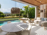 La suite principal ofrece un refugio sereno con vistas exuberantes, un elegante baño y un rincón secreto de juegos. Otras habitaciones adicionales, una cocina al aire libre, jacuzzi, sala de cine y comodidades ecológicas completan esta impresionante casa familiar.