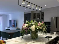 Plano de cocina moderna, 4 dormitorios, 4 baños, gran terraza con acceso al jardín verde.