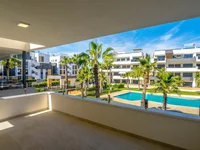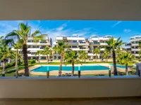 La terraza está orientada al sur/oeste por lo que es ideal para el sol de mediodía y tarde y tiene una hermosa vista hacia la piscina y zona comunitaria con palmeras.
