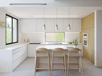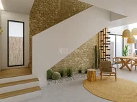 ● La planta baja consta de porche de entrada, recibidor con armario empotrado, salón - comedor - cocina, lavadero integrado, aseo y amplio dormitorio con baño en suite y plato de ducha tipo lluvia interior. ● Planta superior, donde se ubicará la zona de noche con una magnífica suite principal compuesta por un dormitorio con vestidor integrado y un amplio baño en suite de diseño exclusivo. Diseño abierto. En el rellano de la escalera, doble altura con visuales al living-comedor desde su pasarela en planta alta. Además, 2 amplios dormitorios con un magnífico baño contiguo con bañera familiar. ● Diseño de hall de entrada, en blanco impecable, con texturas y materiales naturales, con aire fresco y armonía, como bienvenida al hogar. Majestuosa escalera de acceso a 1ª planta, con revestimiento de piedra natural. Armario empotrado en la entrada de la vivienda y espacio específico para lavadora/secadora integrada, con instalaciones según normativa. ● Diseño de salón, con estilo ibicenco, en tonos piedra y blanco, creando un ambiente acogedor. ● 4 baños/aseos en toda la vivienda, con diseños resueltos con lavabos sobre encimera de cemento, en contraste con el color blanco dominante correspondiente al porcelánico de 1ª calidad en las paredes.