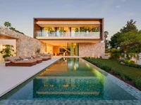 Diseñada con piedra natural, madera y amplios ventanales de suelo a techo, la villa se integra perfectamente en el paisaje, conectando los espacios interiores con los jardines y aportando una sensación de amplitud y armonía. La planta principal presenta un elegante salón de planta abierta con comedor y una cocina de diseño en madera clara que se abre a las terrazas y al jardín. En este nivel también se encuentra una suite de invitados con acceso privado al exterior.