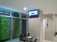 Dentro de la habitación hay electrodomésticos completos (nevera, TV, secador de pelo, plancha, calentador de agua, microondas).