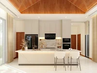 El techo abovedado, adornado con vigas de madera natural, mejora la estética tropical y destaca los elementos naturales. Esta combinación crea un sentido de grandeza y lujo al entrar en la villa.