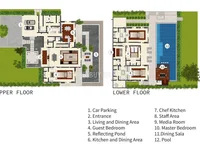 Las zonas al aire libre de esta villa ofrecen varios espacios para la relajación y el disfrute, incluyendo una terraza solitaria amueblada con una piscina reflectante y impresionantes vistas al mar, una terraza parcialmente sombreada con asientos, tumbonas y camas de día, y un pabellón de comedor al aire libre. También hay una mesa de tenis de mesa. La piscina infinita de 30 metros tiene una zona poco profunda para niños y un bar de baño, y más allá de la piscina es un enorme jardín que conduce a una playa serena.