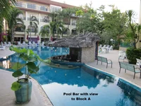 The 120 m2 deluxe apartment is within a development of 56 units in 4 blocks. It is at the end of Block A with additional windows on the side, making it bright and airy. Located on the ground floor it avoids climbing stairs (upper floors have no lifts). The separation from the pool through landscaped gardens ensures full privacy. Unlike most other apartments, which are close to the pool, there is no disturbence by strangers sitting in front of the apartment. A small garden is at the outside, which is practically for private use. It has a master bedroom, guest bedroom, kitchen, living area, bathroom, WC with basin, air condition and ceiling fans. Included is full furniture, essential appliances, cutlery, crockery, linen, TV and free WiFi.