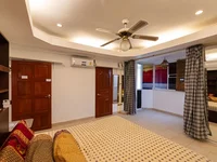 This 1-bedroom, 2-bathroom unit is located in the Center Condotel building in South Pattaya. The layout includes a spacious living area that can comfortably accommodate overnight guests with a sofa bed setup.