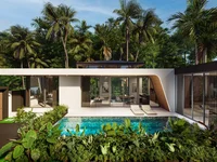 Villa moderna en un complejo privado en las colinas de la zona de Naithon. El diseño combina minimalismo y confort tropical: acristalamiento panorámico y puertas correderas de vidrio llenan la casa con luz y desenfoque los límites entre el interior y la zona de relajación junto a la piscina.