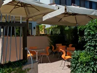 • Una zona de verano ajardinada con un estanque, vegetación, arbores y paraguas amueblados