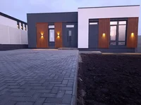 Una trama de 4.5 acres de la forma correcta con una carrera para un automóvil. Coloque para 2-4 autos. El sitio está ennoblecido, se asigna para automóviles, para relajarse y para el césped o espacios verdes. Una cerca de concreto está a lo largo del perímetro del sitio. Se instalan puertas automáticas.