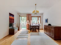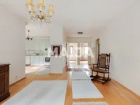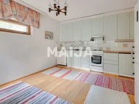 The heart of the home is a fairly sized kitchen that easily transforms into a common gathering place for the family. From the living room there is access to a glazed balcony with lush views of the park. The apartment has parquet floors, and in the sauna you can relax under the steam of the electric stove.
