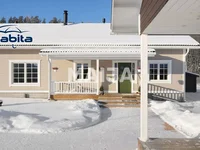 The atmospheric, spacious sauna provides good baths. The classic aesthetics of the washroom will delight the bather. The glass-roofed back terrace offers a good peace for chilling out. The heating system is an energy-efficient exhaust air heat pump, which is supported by a circulating air fireplace.