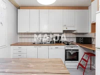 On the upper floor of the apartment are two bedrooms, a bathroom and a private sauna — a functional and peaceful complex for everyday life and relaxation. There is plenty of storage space thanks to the cupboards upstairs.