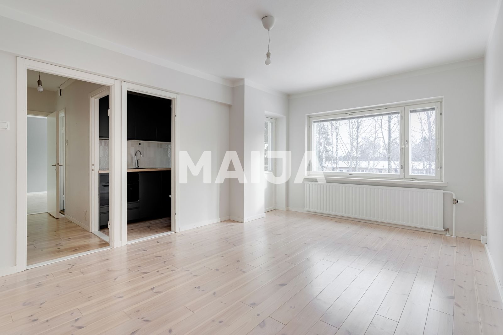 A modern, compact kitchen closet with its own window combines functionality and aesthetics. The balcony opens onto a tranquil courtyard — the lush green view provides a soft counterbalance to the urban location.