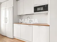 Two bedrooms offer peaceful spaces for rest, and both have practical sliding door cabinets. The stylish and spacious bathroom is equipped with a space reserved for a washing machine, and a private sauna crowns the comforts of this home.