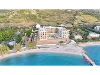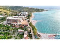 Résidence de luxe à Radhimë, première ligne de construction, avec vue panoramique sur la baie de Vlorë et accès direct à une plage privée. Complexe résidentiel moderne de 4 étages avec architecture contemporaine, design de station balnéaire et construction de qualité.