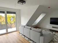 Le salon dispose de parquets de haute qualité et d'un agréable chauffage au sol qui procure une chaleur agréable. De là, vous pouvez atteindre le balcon accueillant, qui est parfait pour des heures de détente en plein air – que ce soit le petit déjeuner donnant sur le vert ou le jour pour finir.