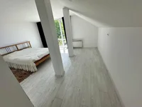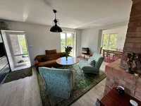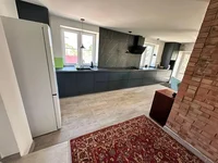 Une cheminée, un coin canapé et une grande cuisine élégante et fonctionnelle créent un confort spécial de l'espace. La cuisine est équipée de lave-vaisselle et machine, induction cuisinière électrique et gaz, hotte. Toutes les connexions TV et Internet ont été supprimées. Depuis le salon il y a une sortie vers la cour jusqu'à la zone de loisirs.