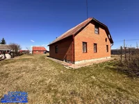 La maison avec un grenier, construit en rondins et face à la brique rouge.