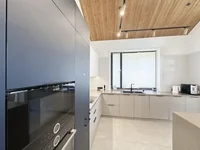 Cuisine moderne avec îlot, raccords Blum et Bosch, Siemens, appareils Elica, filtration d'eau, grand lavabo en granit et système de stockage pratique.