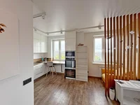 Spacieux salon (25,9 m2) combine les fonctions de la cuisine et du salon.