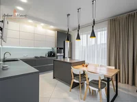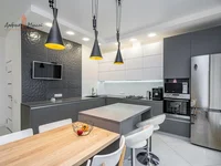 Cuisine intégrée avec lave-vaisselle Electrolux, surface de cuisson Simfer, four Samsung et four à micro-ondes, réfrigérateur LG, toutes les portes et tiroirs avec des fermetures et des accessoires Hettich de haute qualité. Élégantes lampes suspendues.