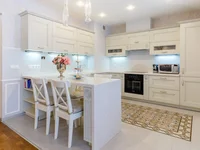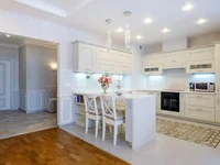 Carrelage italien et espagnol, parquet. Plastique vénitien sur les plafonds, cuisine à commander, cuisine surface-pierre naturelle, tablier-verre trempé, accessoires BLUM, meubles de chambre à coucher dans l'ordre Pologne, tous les meubles à commander, électricien entièrement fait, tous les lustres Italie, lampes LED.