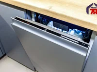 - Oui. La cuisine est décorée de manière concise et fonctionnelle : les façades mates d'une teinte grise profonde sont combinées avec un comptoir chaud sous l'arbre, créant un équilibre de gravité et de cozness. La zone de travail est bordée de tuiles blanches avec une géométrie soignée, l'équipement intégré est installé, l'éclairage est pensé - il est pratique de cuisiner et de passer du temps ici à tout moment de la journée. La salle à manger s'intègre logiquement dans l'espace et ne surcharge pas l'intérieur.