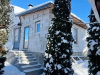 La maison est de 2 étages, en bois avec une nouvelle extension de blocs sur une fondation élevée et un toit de tuiles métalliques (gray graphite) 2025.