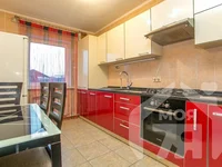 La cuisine, d'une superficie de 9,2 m2, est réalisée dans un design moderne. Façades dans une combinaison spectaculaire de couleurs rouge vif et de lumière élargissent visuellement l'espace. Four intégré et cuisinière à gaz avec hotte rendent la cuisine aussi pratique que possible pour la cuisson.