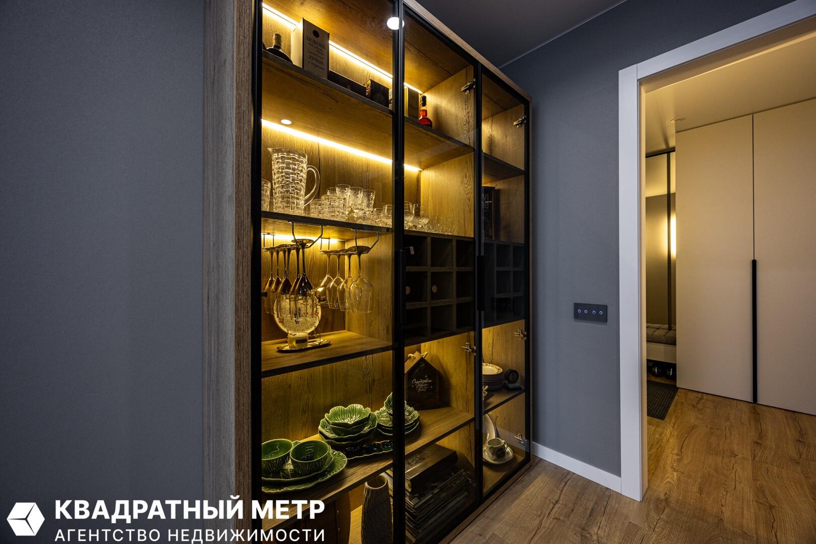 Cuisine moderne 10.2 m2, équipée d'un ensemble de cuisine moderne, façades MDF peintes, resserrages et mécanismes de levage Blum. Équipé d'un équipement intégré de haute qualité, adapté à la fois aux expériences culinaires et aux réceptions: réfrigérateur, surface de cuisson à induction, four et four à micro-ondes Electrolux, lave-vaisselle Bosh, capot intégré et éclairage de la zone de travail.