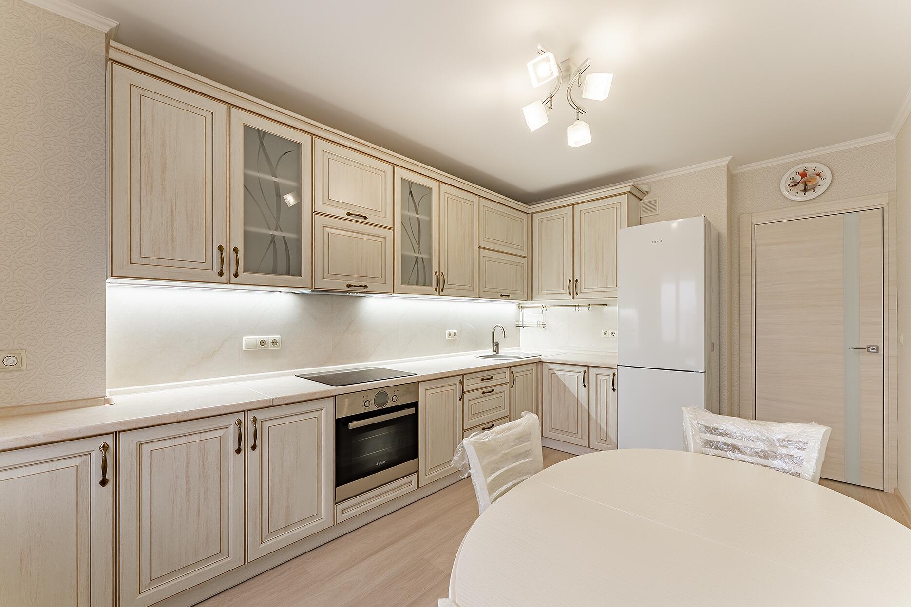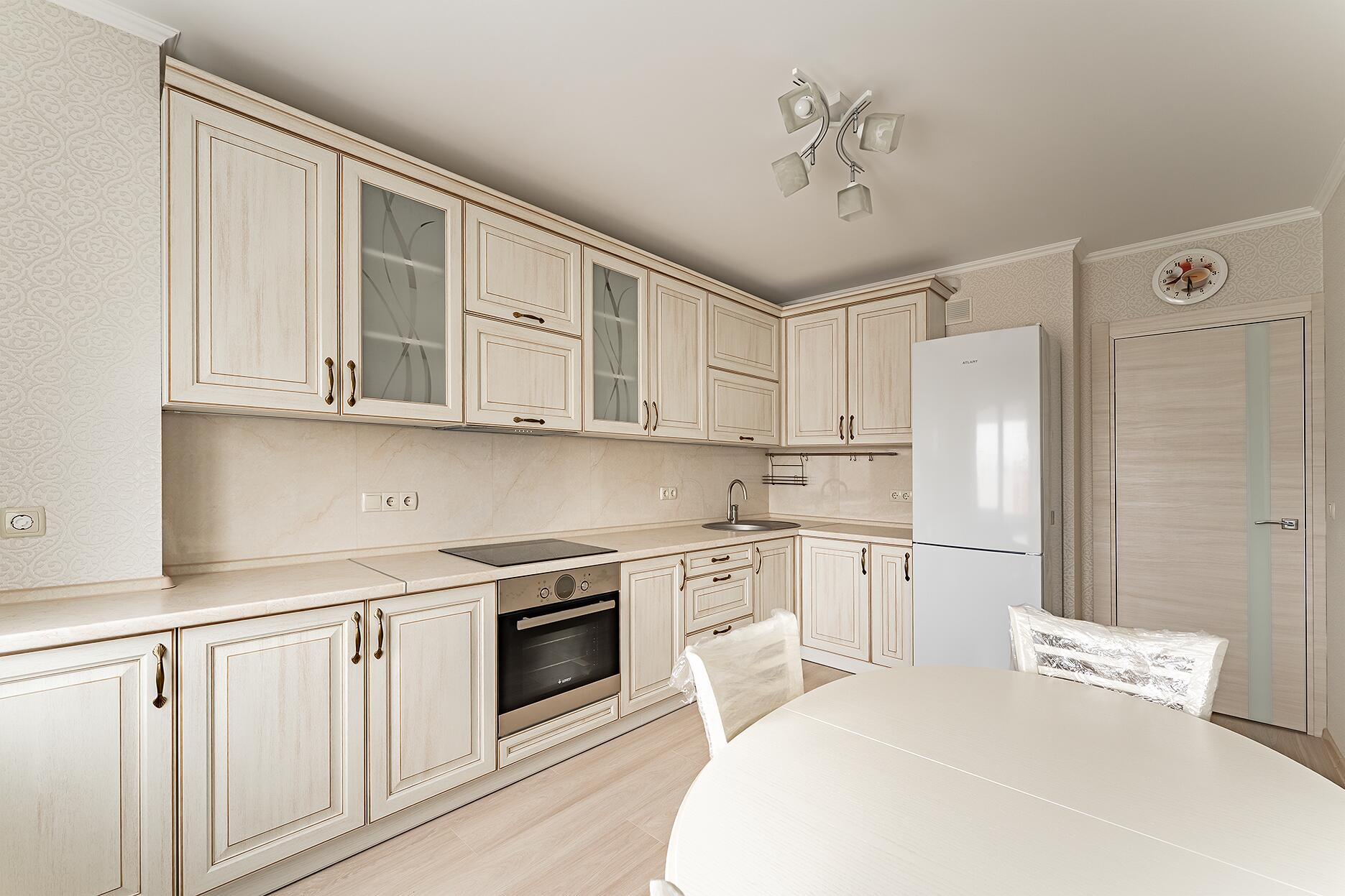 Finition: Sur le sol - durable et beau stratifié, et dans la cuisine et la salle de bains - des carreaux pratiques et élégants.