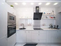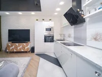 La cuisine intégrée est équipée de tous les meubles et appareils nécessaires. Les façades 3D donnent au salon-cuisine un brillant spécial.