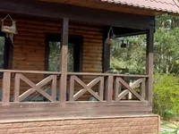 La maison est de 170 m2 d'un seul bois (30 mm), gainé d'un blockhaus épais. La fondation est collée, le sous-sol dans la cuisine, le toit de carreaux métalliques. Le deuxième étage est haut + il y a un grenier.