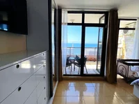 L'appartement de 130 mètres carrés est situé au deuxième étage. L'aménagement est pratique et bien pensé: il dispose de deux chambres confortables, un grand et lumineux salon avec une cuisine, une salle de bains avec WC et baignoire, et une terrasse avec vue panoramique imprenable sur la mer. Les grandes fenêtres fournissent beaucoup de lumière naturelle et créent un sentiment généreux et confortable d'espace.