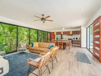 The primary living and kitchen areas on the main floor are surrounded by big windows and sliders for light, airflow, and views of the surrounding flora. The home's two-car garage and two guest suites make up the first level. The master apartment is located on the second story, which also has a patio among the treetops where you can't escape the sounds of the surf. The terrace, which is now open, may be finished with palapas, a partial roof, or any number of ideas to create a truly exceptional place.