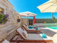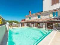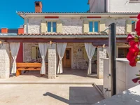 Une moitié de la propriété est une maison en pierre magnifiquement rénovée qui conserve son charme d'origine Istrie, avec des caractéristiques authentiques telles que la pierre exposée et des détails en bois naturel. Cette unité est répartie sur deux étages et comprend un salon spacieux, une cuisine avec un coin repas, un WC invités, trois chambres, une salle de bains et une grande terrasse couverte. La terrasse mène à une cour pavée de pierres avec une piscine privée, parfait pour la vie en plein air et divertissant.