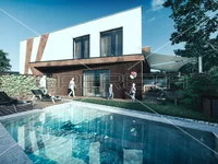 The courtyard consists of a 6 x 2.5 m pool, a sunbathing area, a green zone, and a relaxation area. An additional feature is a parking space with an electric car charging station.