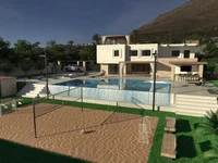 Sur la partie inférieure du terrain sous la piscine il y aura un terrain de volleyball et de soccer de plage avec son propre éclairage pour le jeu du soir. A côté de l'aire de jeux derrière le banc, il y aura une salle de stockage avec équipement de piscine.