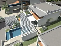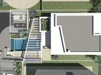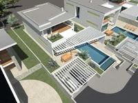 La piscine est entourée d'une grande terrasse pour chaque villa, à l'extérieur du bâtiment est la cuisine d'été et la verdure.